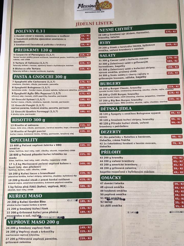 Big Ben, restaurace s nádechem staré Anglie, je od ledna opět v provozu. Kromě nabídky jídel v restauraci (viz foto) mají i klasickou nabídku pizzerie. Z webu původní restaurace citujeme: " Příjemné posezení v restauraci, která se nachází v krásné městské části Brna, kde Vás zaujme staroanglický styl doplněný vitrážemi a přesnou kopií Big Benu s originálním zvukem." Adresa: Libušino údolí 140 623 00 Brno - Kohoutovice Big Ben restaurace v Kohoutovicích znovu otevřela, má i pizerii Messina